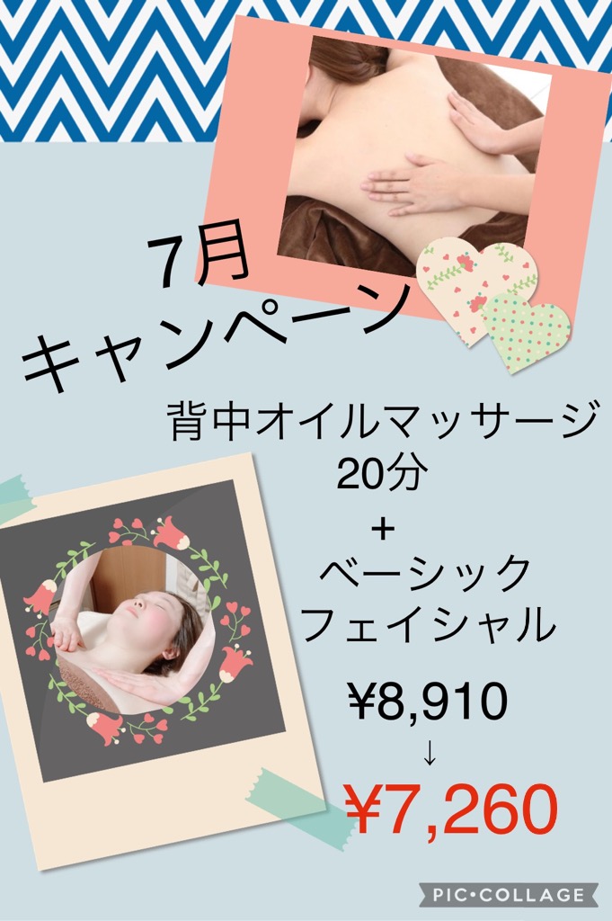 肩こりやお顔のくすみ、お顔の浮腫みや小顔になりたいという方は是非7月キャンペーンの背中のマッサージとベーシックフェイシャルをご利用ください☺️