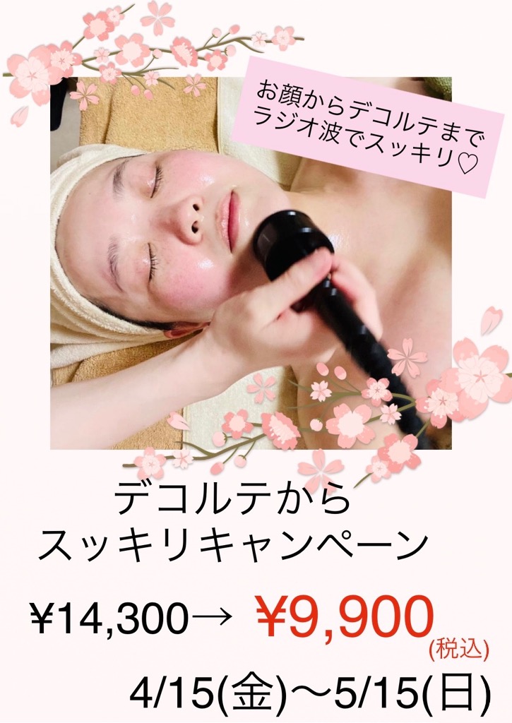 肌代謝を高めて肌の機能を活発にし、コラーゲン生成力を高めてくれるラジオ波で、デコルテからお顔スッキリキャンペーンを4月15日(金)〜5月15日(日)まで実施します。
