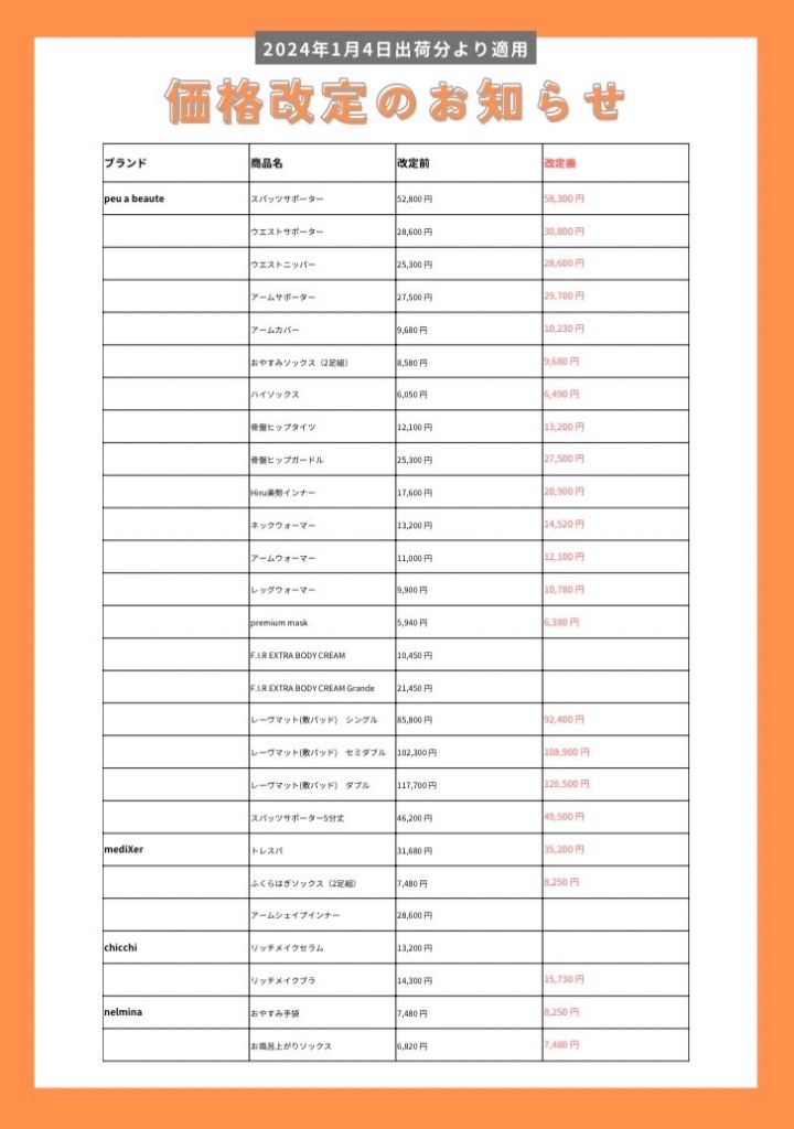 光電子のスパッツなどが価格改定いたしますので、お知らせです。